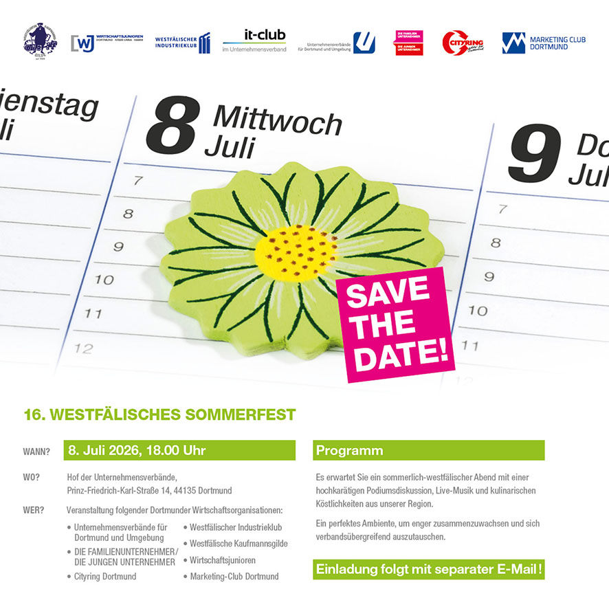Bitte merken Sie sich bereits heute den Termin für eines der zentralen Networking-Events der Dortmunder Wirtschaft vor: Am 8. Juli 2026 ab 18:00 Uhr laden die Unternehmensverbände gemeinsam mit weiteren Dortmunder Wirtschaftsorganisationen zum 16. Westfälischen Sommerfest ein. Veranstaltungsort ist der Hof der Unternehmensverbände, Prinz-Friedrich-Karl-Straße 14 in Dortmund.